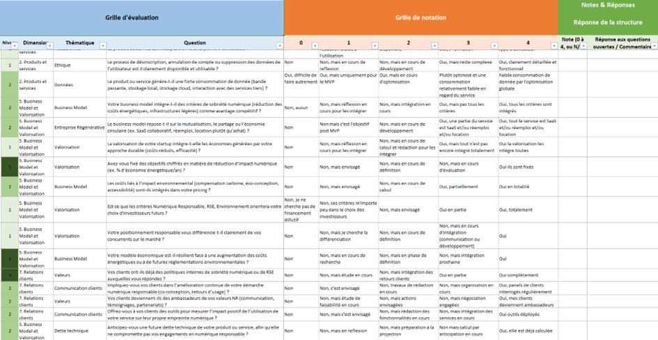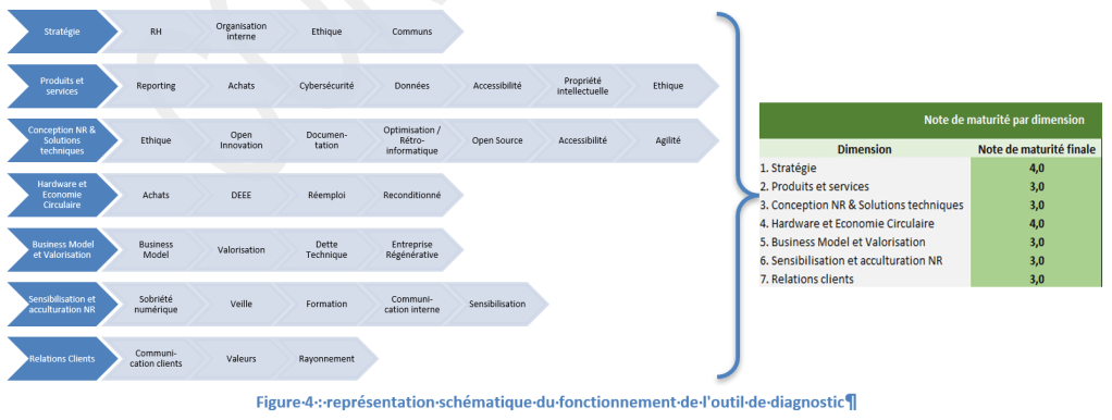L’outil, dont une capture d’écran est reproduite en figure 3, permet de disposer d’une première photographie permettant de prioriser les actions à mener. L’outil est basé sur 100 questions couvrant les principaux leviers de l’innovation numérique responsable (schématisé en figure 4) :